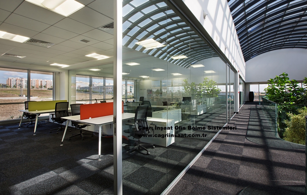 Ofis içinde kullanılan cam bölme modelleri, hem gün ışığından maksimum yararlanma sağladı hem de alanın ferahlığını artırdı.